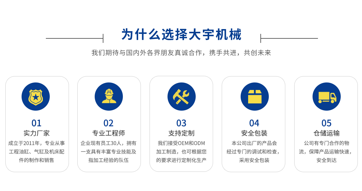 馬鞍山市大宇機械有限公司 INTRODUCTION 馬鞍山市大宇機械制造有限公司成立于2011年06月,注冊資本80萬元人民幣,位于博望區博望鎮鎮西工業園區,占地4000平方,主要從事壓料缸,油缸,氣缸,折彎機夾模板及機床配件的制造和銷售。...